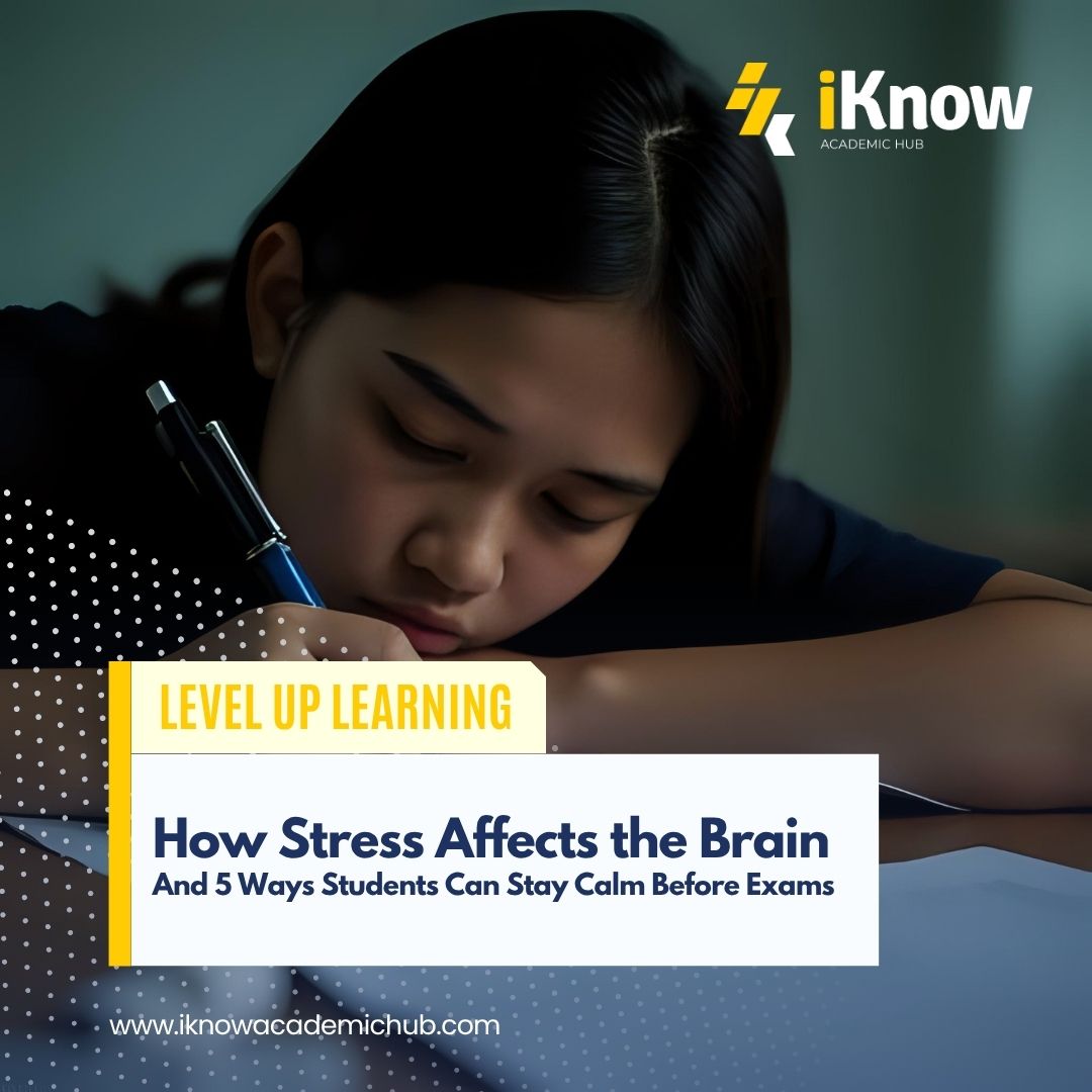 Mon Oct 13 2025Exams are one of the most stressful times in a student’s life — and for parents, watching their child struggle through sleepless nights can be just as worrying. But did you know that stress affects the brain in ways that can actually make studying harder? When stress levels rise, the brain’s ability to focus, store, and recall information drops. Understanding this science can help both students and parents take smarter steps toward a calmer, more effective review period. At iKnow Academic Hub, we believe that managing stress is just as important as mastering the lessons — because confident minds learn best. How Stress Affects the Brain When you’re stressed, your brain releases hormones like cortisol and adrenaline. These chemicals are useful in short bursts — they help you stay alert and energized. However, too much of them can backfire. Memory and focus decline. High cortisol levels interfere with the hippocampus, the part of the brain that stores memories. This means facts you’ve studied may not “stick” as well under pressure . Decision-making slows down. Chronic stress affects the prefrontal cortex, which is responsible for planning and problem-solving. That’s why you might “blank out” during an exam even if you know the answer . Learning becomes harder. Stress reduces the brain’s ability to form new neural connections — essentially, making it harder to absorb new information efficiently . The takeaway? The calmer the brain, the sharper it performs. 5 Ways Students Can Stay Calm Before Exams 1. Create a Realistic Study Plan Instead of cramming, break your review materials into smaller chunks over several days. This helps reduce anxiety and improves long-term memory retention. A steady pace signals to your brain that there’s no “danger” — just progress. 2. Practice Mindful Breathing Just a few minutes of deep breathing can lower cortisol and increase oxygen flow to the brain. Try the 4-7-8 technique: inhale for 4 seconds, hold for 7, and exhale for 8. It helps reset your nervous system for better concentration. 3. Get Enough Sleep Sleep is when the brain consolidates memories — it’s like pressing the “save” button after hours of study. Pulling an all-nighter might seem productive, but it actually decreases recall and reasoning ability the next day . 4. Move Your Body Exercise doesn’t just relieve stress — it boosts dopamine and serotonin, chemicals that improve mood and focus. A short walk or stretching break between study sessions can do wonders for your mental clarity. 5. Find Support in a Study Community Sometimes, stress comes from feeling alone. Joining a review group or study program helps students stay motivated and confident. At iKnow Academic Hub, our supportive learning community and guided review sessions help students face exams with calm and clarity — because no one should face exam stress alone. For Parents: Encouraging Without Pressuring Parents play a big role in how students handle exam stress. Instead of saying “You have to top the test,” try “I’m proud of how hard you’re trying.” Simple reassurance builds emotional safety, which in turn improves performance. At iKnow, we encourage parents to see review programs not just as academic tools, but as emotional support systems — a place where students can find guidance, structure, and encouragement. Stress is part of every academic journey, but it doesn’t have to control it. When students learn how stress affects the brain, they gain the power to manage it — to study smarter, think clearer, and perform better. At iKnow Academic Hub, we help learners prepare not only with academic excellence but with emotional confidence. Our review programs for college and high school entrance exams are designed to build both knowledge and resilience. At iKnow Academic Hub, we believe smarter preparation builds stronger futures. Join our programs today and get the guidance you need to succeed. References: McEwen, B. S. (2017). Neurobiological and systemic effects of chronic stress. Nature Medicine. Arnsten, A. F. T. (2009). Stress signalling pathways that impair prefrontal cortex structure and function. Nature Reviews Neuroscience. Lupien, S. J. et al. (2009). Effects of stress throughout the lifespan on the brain, behaviour and cognition. Nature Reviews Neuroscience. Walker, M. (2017). Why We Sleep: Unlocking the Power of Sleep and Dreams. Scribner.