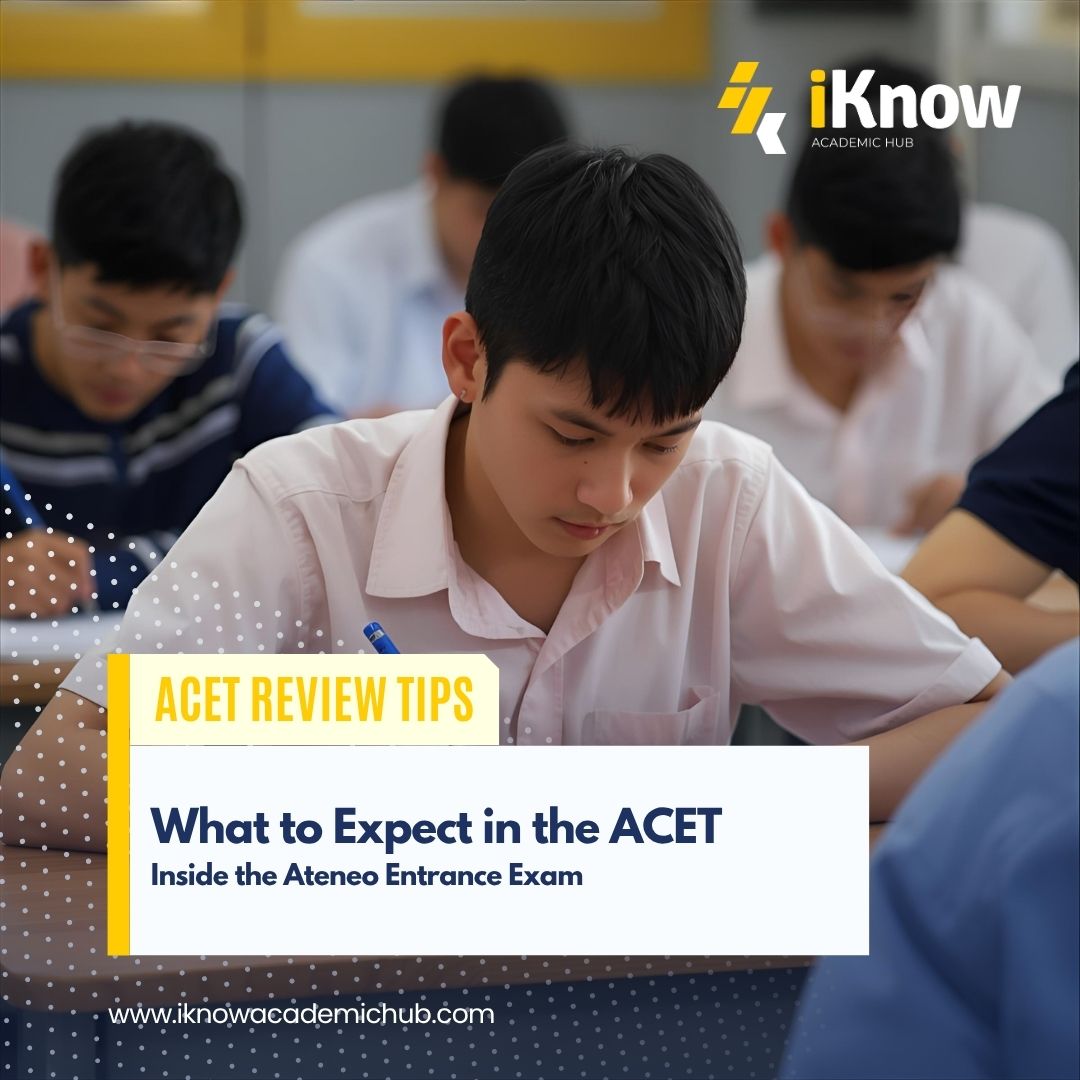 Fri Oct 17 2025Dreaming of becoming a true Atenean? Before you can walk through the gates of the Loyola Schools, you must first conquer one of the most challenging entrance tests in the country—the Ateneo College Entrance Test (ACET). The ACET is known for its tight time limits, analytical questions, and emphasis on critical thinking. It measures how well you can reason, comprehend, and compute under pressure—skills central to Ateneo’s academic philosophy. In this guide, we’ll walk you through what to expect on test day—from the format to question types—and how a focused ACET review can help you prepare with confidence. The ACET at a Glance The Ateneo College Entrance Test (ACET) is designed to evaluate not just what you know, but how you think. It measures your ability to process information quickly, apply logic, and perform under time pressure—skills essential to Ateneo’s holistic and rigorous academic environment. The exam typically runs for two to three hours, depending on the year’s structure, and covers the following key areas: English Proficiency – Tests your grammar, sentence construction, and writing mechanics. Reading Comprehension – Measures how well you understand passages, interpret meanings, and identify main ideas. Vocabulary Proficiency – Assesses your command of words, context clues, and correct usage. Verbal Analogy – Evaluates reasoning and relationships between words and concepts. Mathematics Proficiency – Includes algebra, geometry, arithmetic, and data interpretation, focusing on logical problem-solving. Numerical Ability – Tests how efficiently and accurately you can compute and interpret numerical data. Abstract Reasoning – Involves identifying patterns, sequences, and logical relationships using figures or shapes. Logical Reasoning – Measures your ability to analyze arguments, spot assumptions, and draw valid conclusions. Time Pressure: The True Test of the ACET Many students say the most challenging part of the ACET isn’t just the difficulty—it’s the time pressure. Each section moves fast, giving you little time to linger on one question. This makes time management a crucial part of your preparation. During your ACET review, simulate the actual test by practicing under strict time limits. Learn to skip difficult questions and return to them later. Building this habit can greatly improve your pacing and accuracy. Question Types to Expect Here’s what you’ll encounter during the ACET: 1. English and Reading Comprehension Expect long passages with abstract or analytical themes. You’ll be tested on inference, main idea recognition, and understanding the writer’s tone or perspective. Grammar questions are also context-based, requiring careful reading and comprehension. 2. Vocabulary and Verbal Analogy These sections test your grasp of relationships between words. You’ll encounter analogy pairs (e.g., teacher : classroom :: doctor : hospital) that require logical connections. Vocabulary items may include synonyms, antonyms, and context clues. 3. Mathematics and Numerical Ability Prepare for a mix of algebraic equations, geometry problems, arithmetic word problems, and data interpretation. Ateneo emphasizes reasoning and accuracy, so memorization alone won’t suffice. You’ll need to think critically and compute efficiently. 4. Abstract and Logical Reasoning This part measures your non-verbal intelligence—how well you recognize patterns, sequences, and logical progressions in figures or symbols. Logical reasoning items test argument structure, assumptions, and valid conclusions. How to Prepare for Success A strong ACET review should train your speed, strategy, and stamina—not just your subject knowledge. Here’s how to prepare effectively: Simulate the actual test. Take full-length mock exams under timed conditions. Focus on weak areas. Strengthen your reading comprehension and math reasoning. Build test endurance. Practice staying focused for 2–3 hours straight. Master strategy. Learn to spot easy points first, then tackle harder questions. Reflect often. For essays, read about social issues and form thoughtful opinions. At iKnow Academic Hub, our ACET Review Program focuses on more than memorization. We train you to think critically, manage time, and approach questions strategically through comprehensive modules, mock exams, and expert mentoring. Test Day: What to Expect On exam day, expect strict proctoring and a highly organized process. Bring only essentials: Admission slip Valid ID Two pencils and an eraser Electronic devices and calculators are not allowed. Listen carefully to instructions, budget your time per section, and trust your preparation. The ACET is more than just an entrance test—it’s Ateneo’s way of finding students who can think critically, lead with integrity, and contribute meaningfully to society. While it’s challenging, the right ACET review plan can help you face the exam with confidence and clarity. At iKnow Academic Hub, we believe smarter preparation builds stronger futures. Join our ACET Review Program today and take the first step toward your dream of becoming an Atenean.