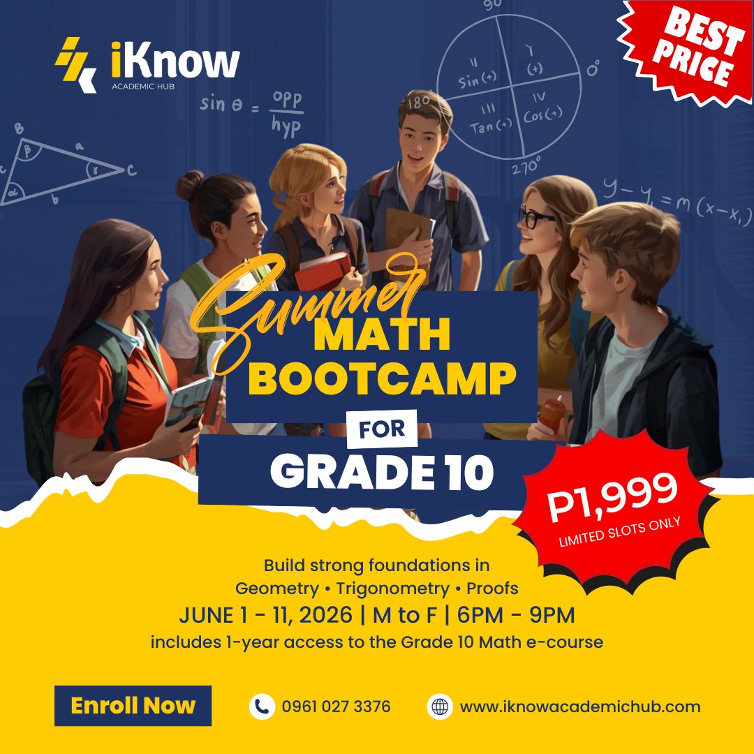 Grade 10 mathematics marks a major leap in abstraction, formal geometry, and trigonometry. Students are expected not only to compute, but to justify, prove, and model relationships mathematically. The iKnow Academic Hub Summer Math Boot Camp for Incoming Grade 10 Students is designed to strengthen these skills early, helping learners enter the school year prepared, confident, and ahead of the curve. This Math Boot Camp / Advanced Classes program focuses on geometry, coordinate geometry, and trigonometry. It builds strong conceptual understanding while training students to solve complex, multi-step problems accurately and efficiently. At iKnow Academic Hub, we believe smarter preparation builds stronger futures. This summer offering equips Filipino students with the reasoning skills and mathematical discipline needed for senior high school and future entrance examinations. Why Join the Summer Math Boot Camp? For Students Grade 10 math introduces proof-based geometry and trigonometry that many students find challenging. This boot camp helps students: Understand geometric relationships and theorems clearly Strengthen trigonometric foundations and applications Gain confidence in solving analytical and word-based problems Develop accuracy, speed, and logical reasoning For Parents Parents can be confident that this program: Reinforces key Grade 10 concepts before the school year begins Reduces academic pressure during regular classes Encourages disciplined study habits and independent thinking Provides structured guidance in a supportive online environment For Schools and Academic Partners This program supports learner readiness by: Strengthening geometric and trigonometric reasoning Reinforcing proof-based problem solving Preparing students for higher-level mathematics and assessments Topics Covered in the Math Boot Camp The program provides a comprehensive and structured coverage of geometry, coordinate geometry, and trigonometry. Geometry Foundations and Proofs Definitions, Postulates, and Theorems Types of Angles, Triangles, and Quadrilaterals Triangle Congruence: SSS, SAS, ASA, AAS, HL Proportionality and Similar Figures Parallelograms, Trapezoids, and Kites Circles and Coordinate Geometry Arcs, Chords, Tangents, and Secants Distance, Midpoint, and Slope Equations of Lines Introduction to Conic Sections Trigonometric Foundations Sine, Cosine, Tangent, and Reciprocal Functions Unit Circle Definitions Right and Oblique Triangles Laws of Sines and Cosines Area of Oblique Triangles Trigonometric Graphs and Identities Amplitude, Period, and Phase Shift Graphing Sine, Cosine, and Tangent Functions Fundamental Trigonometric Identities Sum and Difference Formulas Solving Trigonometric Equations Each topic is taught using step-by-step explanations, guided examples, and targeted practice to ensure mastery and long-term retention. 1-Year Access to Grade 10 Math E-Course Included Enrollment in the iKnow Academic Hub Summer Math Boot Camp includes 1-year access to the Grade 10 Math e-course. This allows students to continue reviewing and reinforcing lessons even after the live summer sessions end. What Students Receive Recorded Grade 10 math lessons aligned with school topics Clear video explanations of geometry and trigonometry concepts Practice problems for independent review Flexible, self-paced access throughout the school year This added support helps students stay confident and prepared for quizzes, exams, and advanced math lessons. Program Schedule and Format Dates: June 1 to June 11 Days: Monday to Friday Time: 6:00 PM to 9:00 PM Mode: Online via Zoom Fee: β‚±1,999 The evening schedule allows focused learning while fitting comfortably into students’ daily routines. Why Choose iKnow Academic Hub? iKnow Academic Hub is a trusted review and tutorial center dedicated to empowering Filipino students to succeed in academic challenges and entrance examinations. Our programs emphasize: Concept-based instruction Logical and proof-driven reasoning Guided practice and confidence building We teach students not just how to solve problems, but how to think mathematically. Prepare Early for Grade 10 Success Grade 10 math plays a critical role in preparing students for senior high school, entrance exams, and STEM-related tracks. Early preparation makes a real difference. At iKnow Academic Hub, we believe smarter preparation builds stronger futures. Join our Summer Math Boot Camp and give your child the support they need to excel in Grade 10 mathematics. Register here: https://forms.gle/a7kRLuRkkZGbV6fQ6