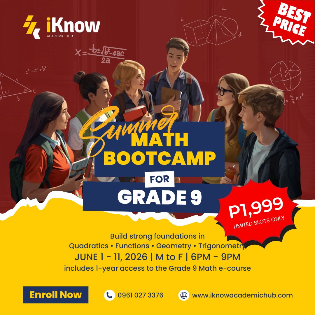 Grade 9 mathematics is a turning point where algebra becomes more abstract and geometry begins to connect with real-life applications. Concepts like quadratic equations, rational expressions, and trigonometry require deeper understanding and strong problem-solving skills. The iKnow Academic Hub Summer Math Boot Camp for Incoming Grade 9 Students is designed to help learners master these topics early and enter the school year with confidence. This Math Boot Camp / Advanced Classes program focuses on building clarity in quadratic concepts, strengthening algebraic reasoning, and applying geometry and trigonometry to real-world problems. At iKnow Academic Hub, we believe smarter preparation builds stronger futures. This summer offering supports Filipino students by helping them understand not just how formulas work, but why they work. Why Join the Summer Math Boot Camp? For Students Grade 9 math often introduces topics that feel overwhelming without proper guidance. This boot camp helps students: Master quadratic equations and functions with confidence Strengthen algebraic thinking and problem-solving skills Understand graphs, models, and real-life applications Build a strong foundation for higher-level math For Parents Parents can feel assured that this program: Prepares students for the academic demands of Grade 9 Reduces school-year stress by introducing key topics early Reinforces logical thinking and accuracy Provides structured, teacher-guided online learning For Schools and Academic Partners This program supports learner readiness by: Strengthening algebra and function-based reasoning Reinforcing geometry and trigonometry fundamentals Encouraging mastery-based learning and analytical thinking Topics Covered in the Math Boot Camp The program offers a balanced and comprehensive coverage of algebra, geometry, and trigonometry aligned with Grade 9 requirements. Quadratic Equations Defining quadratic equations Solving by factoring Solving by completing the square Solving using the quadratic formula Graphing quadratic equations Solving real-life word problems involving quadratics Quadratic Inequalities and Functions Modeling quadratic functions Solving quadratic inequalities Finding roots and understanding the nature of roots Vertex form and graph interpretation Rational Algebraic Expressions and Inequalities Simplifying rational algebraic expressions Solving rational equations and inequalities Graphing rational expressions Variation and Radicals Direct, inverse, joint, and combined variations Simplifying radical expressions Operations involving radicals Geometry and Trigonometry Properties of parallelograms and trapezoids Triangle similarity Right triangle trigonometry Applications of geometric and trigonometric concepts Relations and Functions Introduction to relations and functions Linear relations Cartesian coordinate systems Understanding inputs and outputs Each topic is taught using step-by-step explanations, guided practice, and problem-solving sessions to ensure real understanding and mastery. 1-Year Access to Grade 9 Math E-Course Included Enrollment in the iKnow Academic Hub Summer Math Boot Camp includes 1-year access to the Grade 9 Math e-course. This allows students to continue reviewing lessons and strengthening their skills throughout the school year. What Students Receive Recorded Grade 9 math lessons aligned with school topics Clear video explanations for difficult concepts Practice problems for reinforcement and review Flexible, self-paced access anytime during the year This extended support ensures students stay confident and prepared long after the summer program ends. Program Schedule and Format Dates: June 1 to June 11 Days: Monday to Friday Time: 6:00 PM to 9:00 PM Mode: Online via Zoom Fee: β‚±1,999 The evening schedule allows students to focus on learning while balancing daily routines. Why Choose iKnow Academic Hub? iKnow Academic Hub is a trusted review and tutorial center dedicated to empowering Filipino students to succeed in academic challenges and entrance examinations. Our programs emphasize: Concept-based instruction Guided problem solving Confidence building through structured practice We help students learn how to think mathematically, not just how to apply formulas. Get Ready for Grade 9 with Confidence Grade 9 math lays the groundwork for advanced algebra, trigonometry, and senior high school mathematics. Preparing early can make a lasting difference. At iKnow Academic Hub, we believe smarter preparation builds stronger futures. Join our Summer Math Boot Camp and give your child the support they need to succeed in Grade 9. Register here: https://forms.gle/a7kRLuRkkZGbV6fQ6