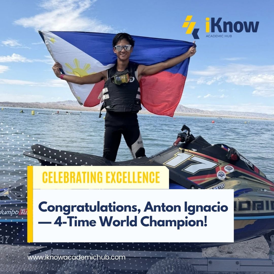 Fri Oct 10 2025We at iKnow Academic Hub proudly celebrate the phenomenal success of our former student, Anton Ignacio, who continues to make waves—literally and globally! At the 2025 SBT IJSBA World Finals held in Lake Havasu City, Arizona, USA, Anton once again proved his unmatched skill and determination on the water, claiming two new world titles that officially make him a 4-Time World Champion. These victories bring immense pride to the Philippines and solidify Anton’s legacy as one of the country’s most accomplished watercraft racers—with world titles from 2023, 2024, and now two more for 2025. A Legacy of Champions: Anton’s World Titles Anton’s global victories showcase his consistency and mastery in personal watercraft racing. Here’s a look at his impressive journey: 2023 IJSBA World Finals – Lake Havasu City, USA Pro Am Runabout 1100 Stock – World Champion 2024 IJSBA World Finals – Lake Havasu City, USA Runabout Naturally Aspirated – World Champion 2025 IJSBA World Finals – Lake Havasu City, USA Pro Am Runabout 1100 Stock – World Champion Runabout Naturally Aspirated – World Champion Four titles in just three years—a testament to his discipline, focus, and world-class dedication. A Champion with Heart Behind every trophy lies years of relentless training, perseverance, and passion. Despite competing among the best racers in the world, Anton once again rose to the top—representing not just his racing team and family, but the entire Filipino nation. His journey inspires students everywhere: success isn’t just about raw talent, but about discipline, balance, and the courage to dream big. From iKnow to the World Anton’s story reminds us that great things start with preparation and focus—values we nurture at iKnow Academic Hub. We’re honored to have been part of his academic foundation years before he conquered the global racing stage. His achievements serve as a shining example to all our students: whether your dream is in science, sports, or engineering, dedication and guided learning can take you anywhere. Event: 2025 SBT IJSBA World FinalsDate: October 9, 2025Location: Lake Havasu City, Arizona, USAOfficial Results: IJSBA.com – 2025 SBT World Finals Results iKnow Academic Hub: Nurturing Future Champions At iKnow Academic Hub, we believe every student has the potential to excel—with the right guidance, structure, and motivation. From academic tutorials to entrance exam reviews and specialized courses, we help young achievers like Anton unlock their full potential—whether in the classroom or beyond. Congratulations once again, Anton Ignacio—4-Time World Champion!Your iKnow family celebrates this historic milestone with pride!